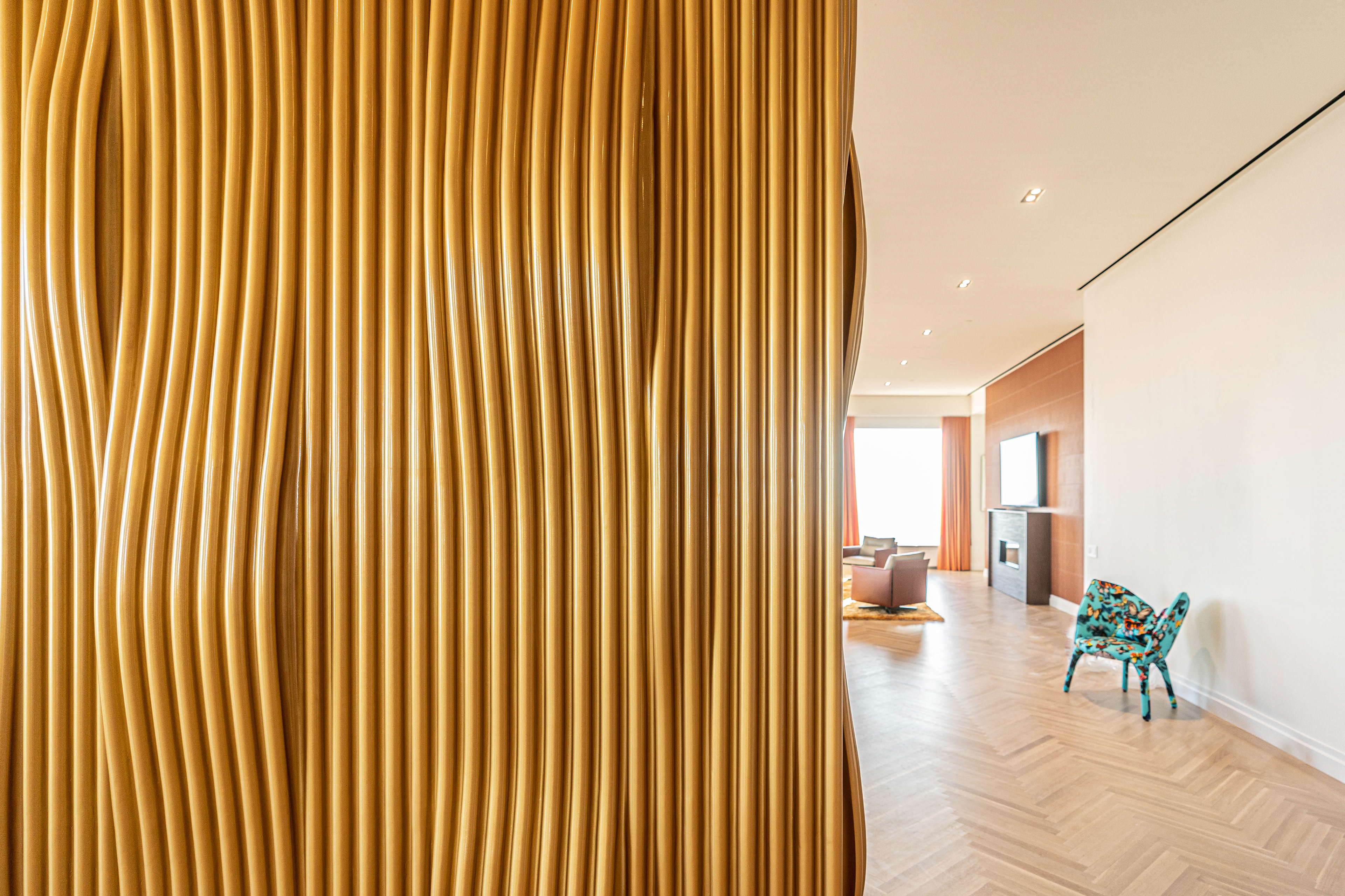 This is a custom parametric wall designed, rendered, created, installed, and photographed, using the latest technology.